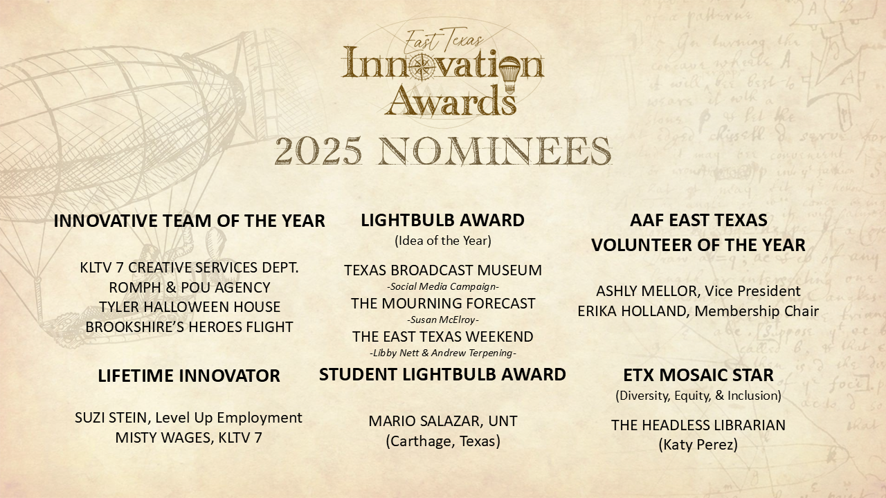 Welcome to the East Texas Innovation Awards submission portal! We’re excited to recognize the outstanding creativity, innovation, and dedication that drives our East Texas advertising and marketing community forward.